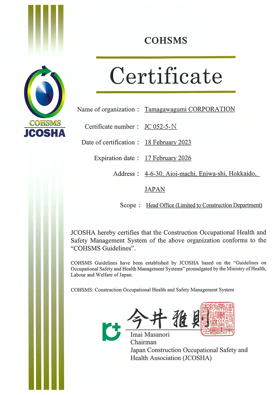 玉川組は、平成23年2月18日建災防よりCOHSMS(コスモス:建設業労働安全衛生マネジメントシステム)認定証の交付受けました。